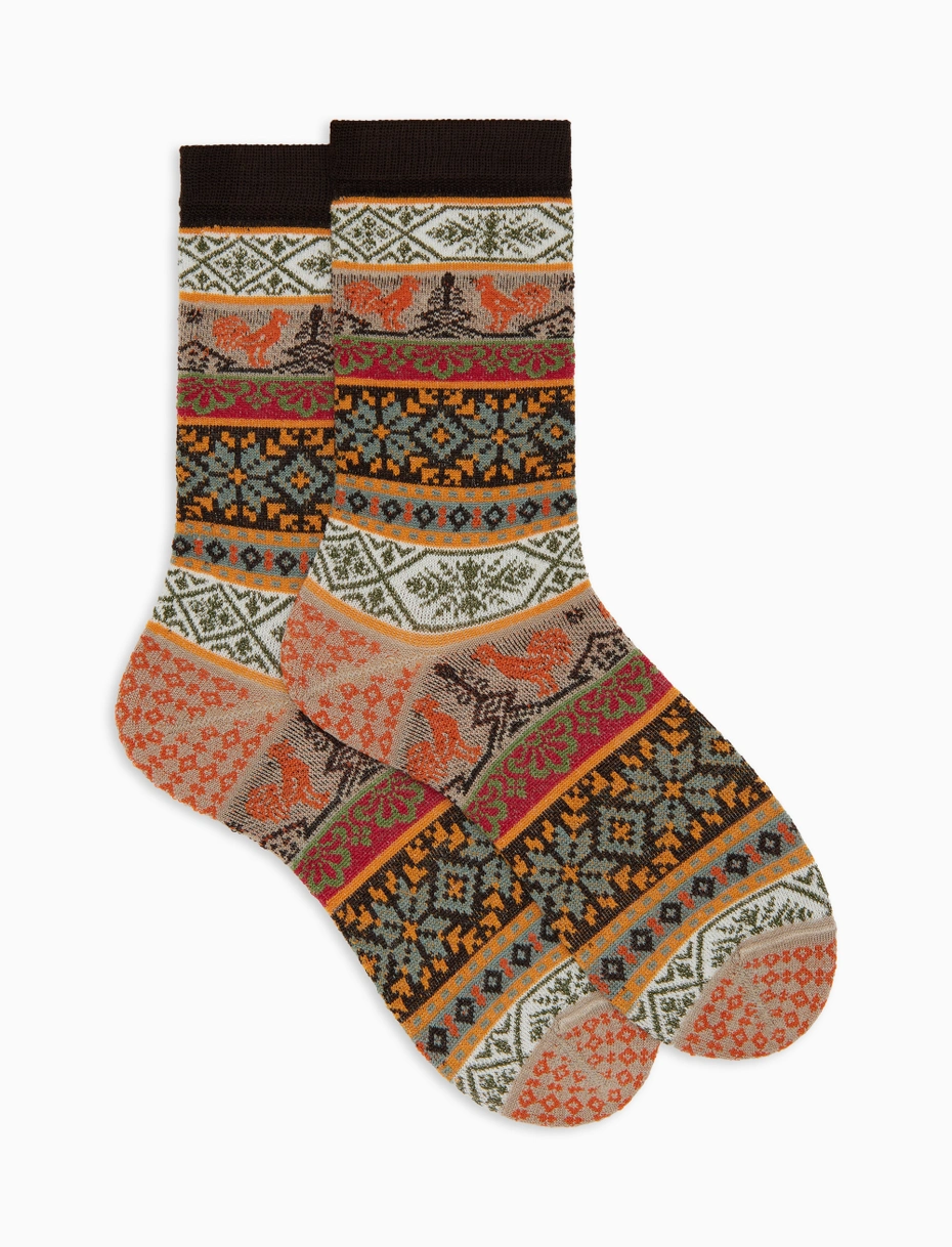 Calze corte da donna in morbida lana decorate con una raffinata fantasia greca natalizia arricchita da un effetto scintillante. Perfette per celebrare le feste con stile e comfort. Un capo firmato Gallo, eccellenza italiana dal 1927.