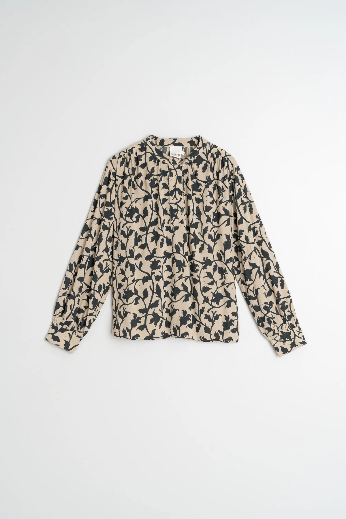 Camicia con collo alla coreana caratterizzata da fantasia fiore. Le arricciature sulle spalle conferiscono volume al capo, mentre il bottone sul colletto permette di indossarla sia aperta che chiusa.