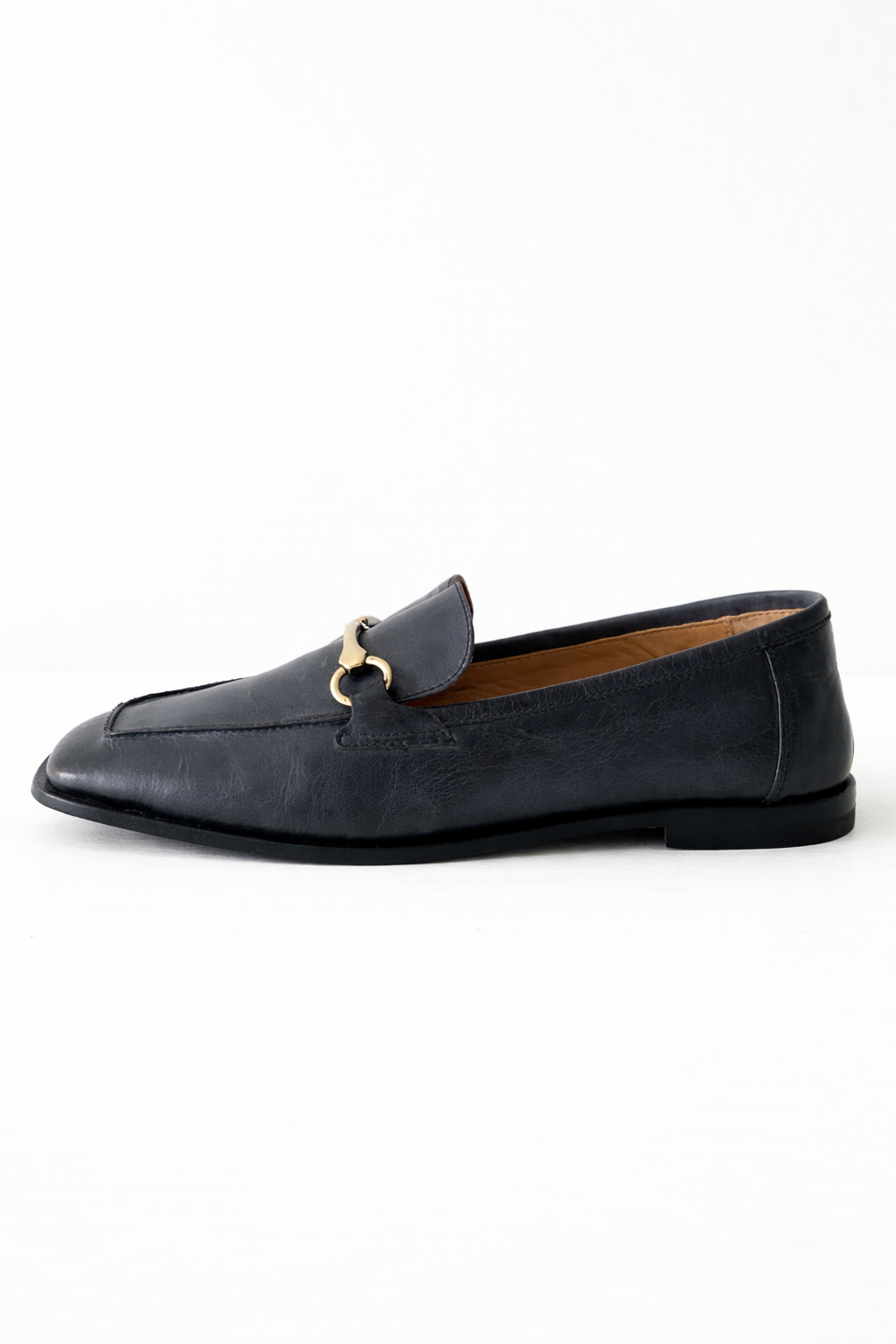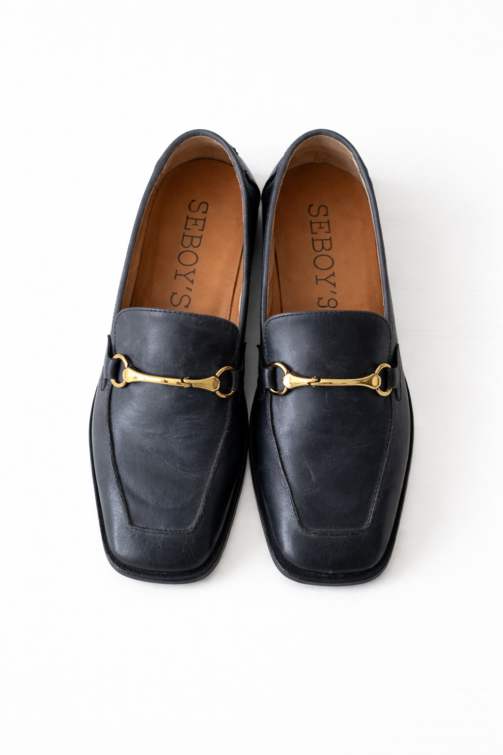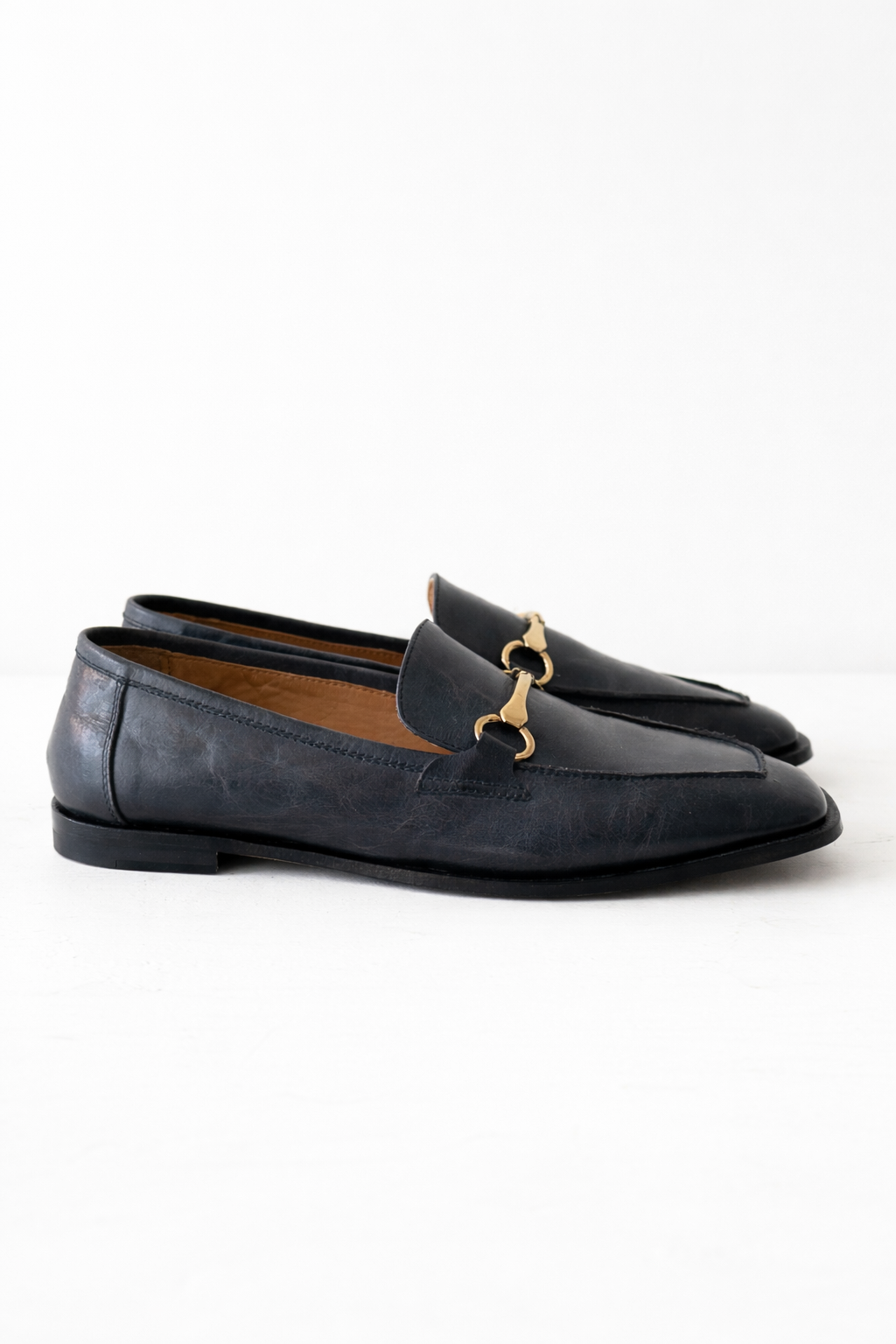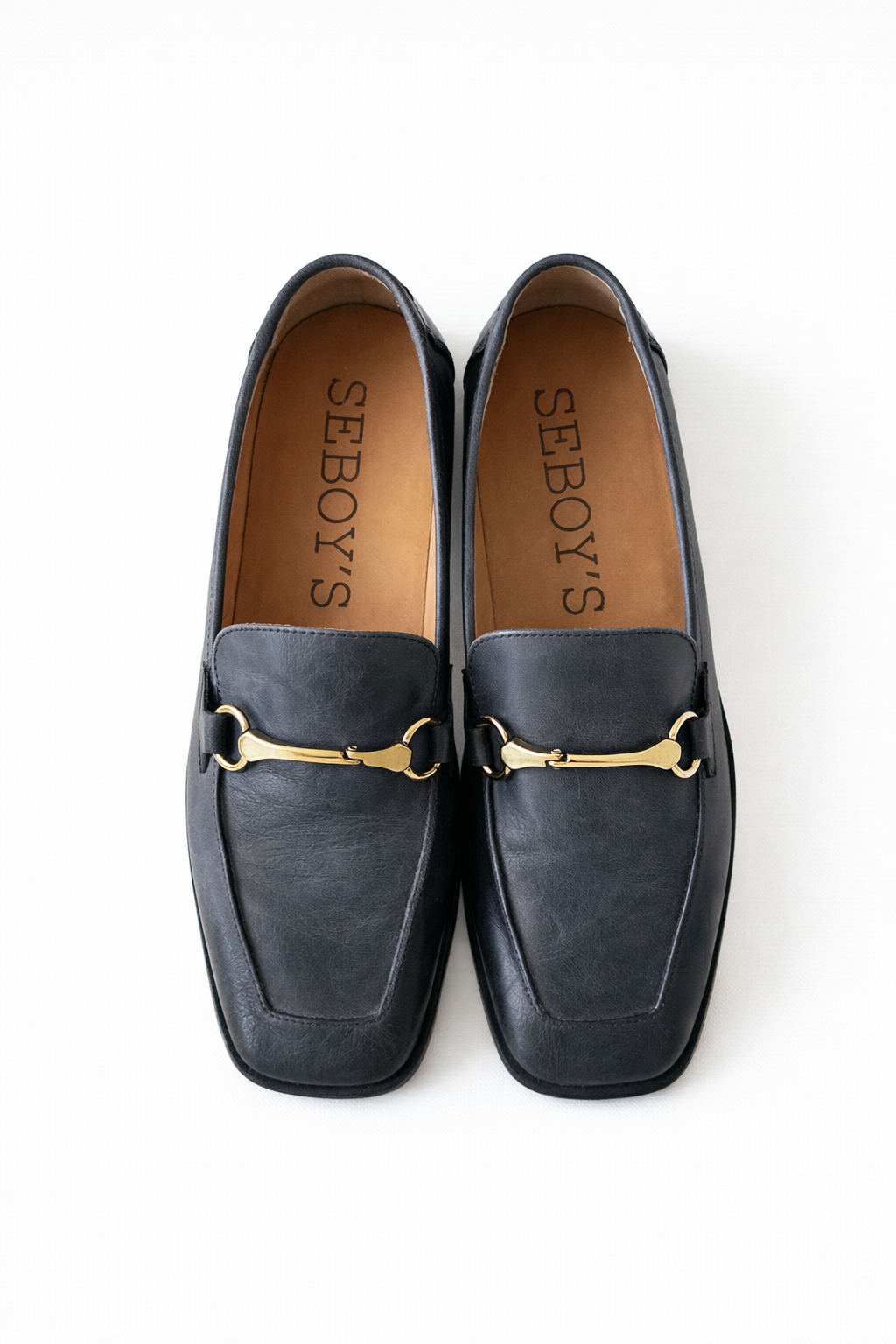 Mocassino Seboy’s a punta quadrata in pelle blu, caratterizzato da un elegante morsetto argento e finiture curate.