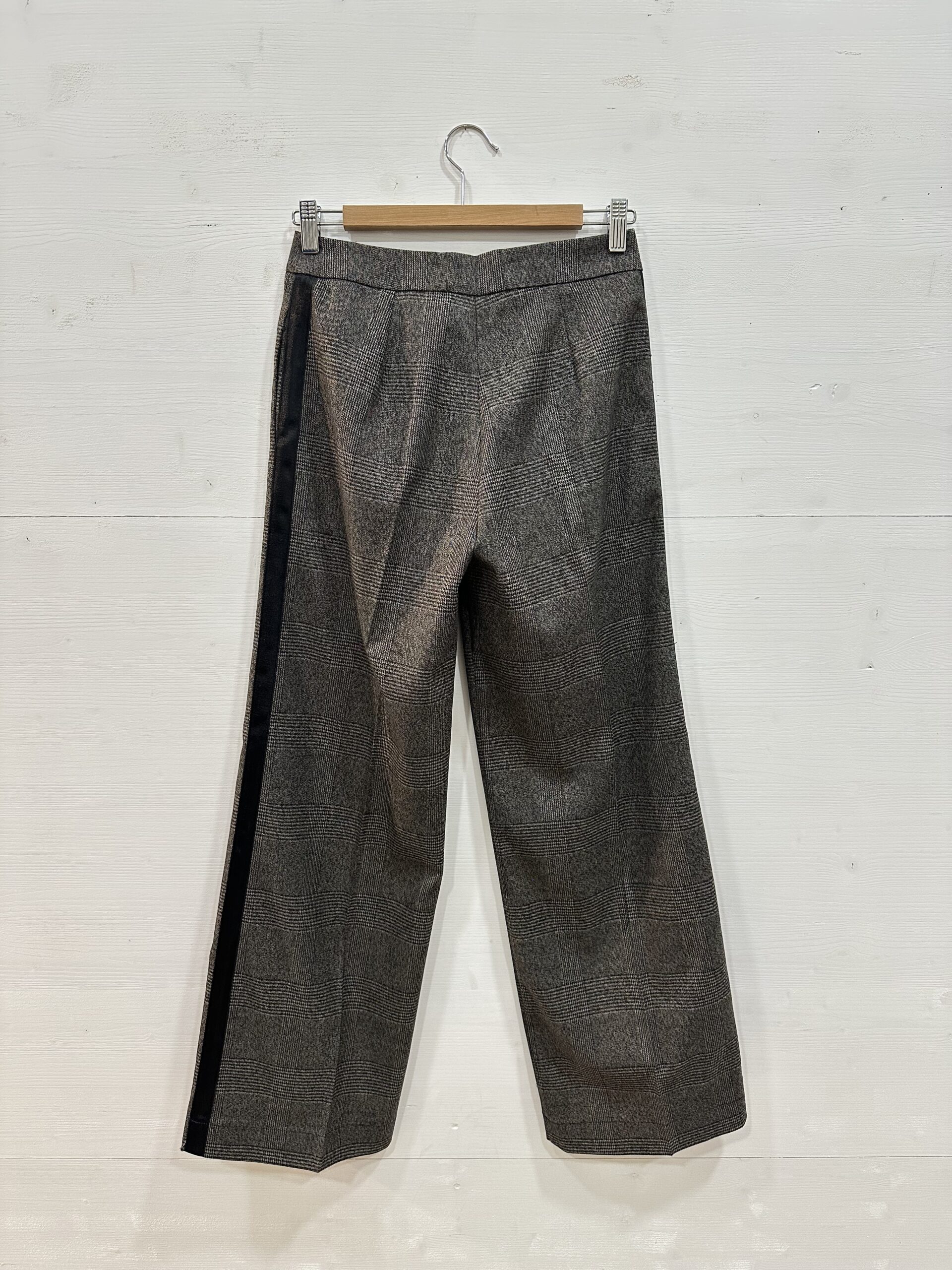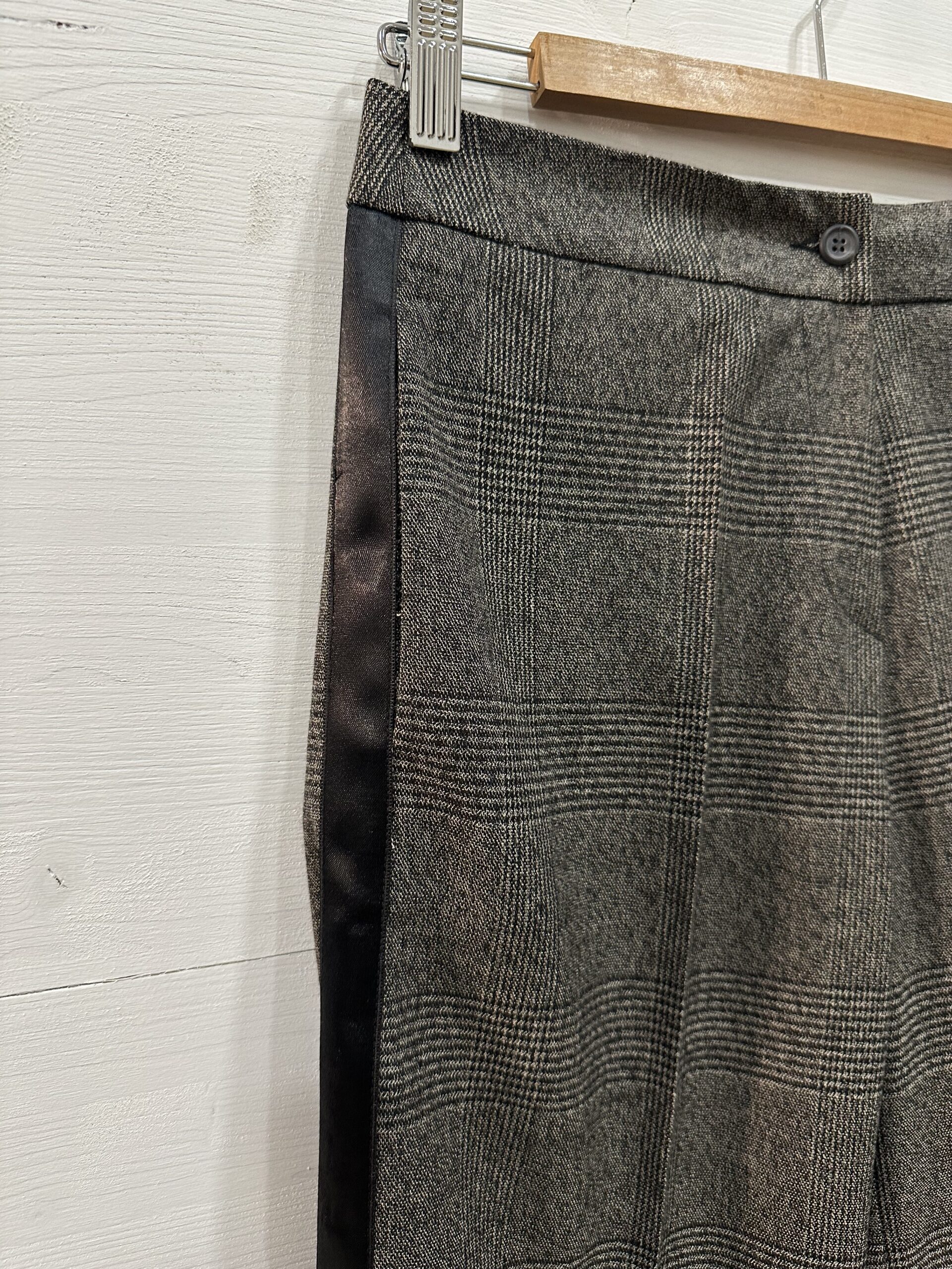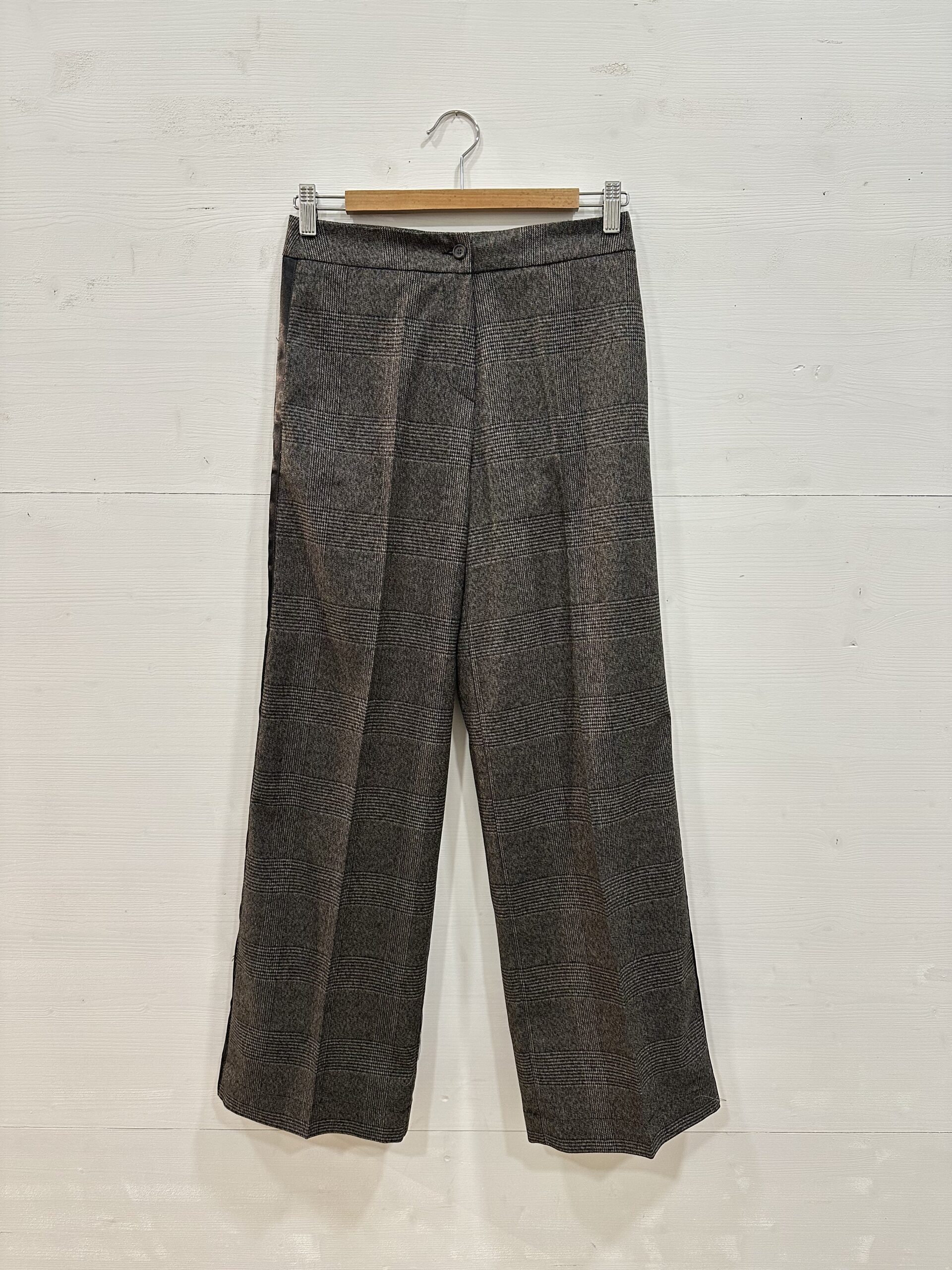 Pantalone a gamba ampia di Prani, fantasia check caramello e nero con bande nere laterali in raso.