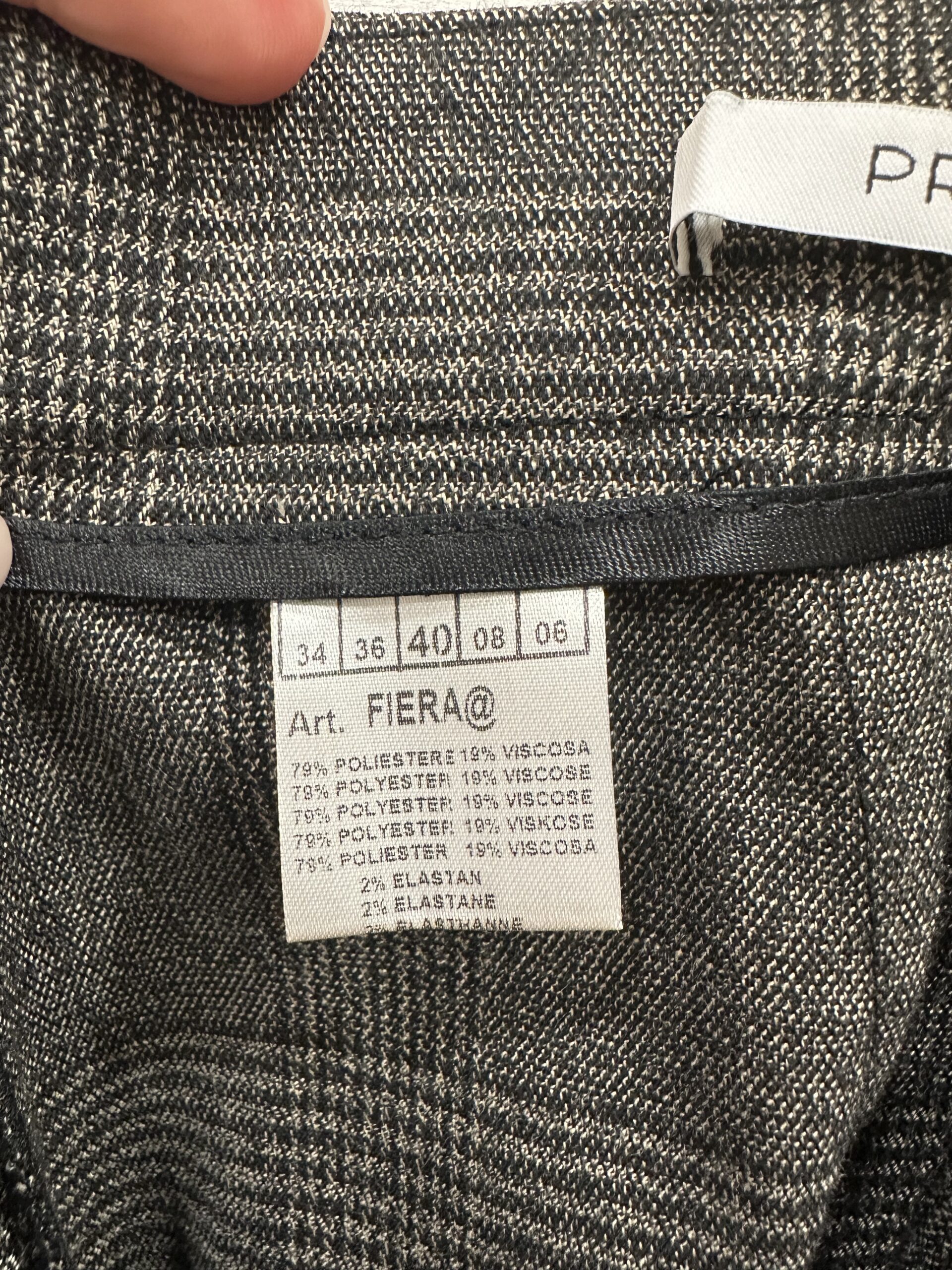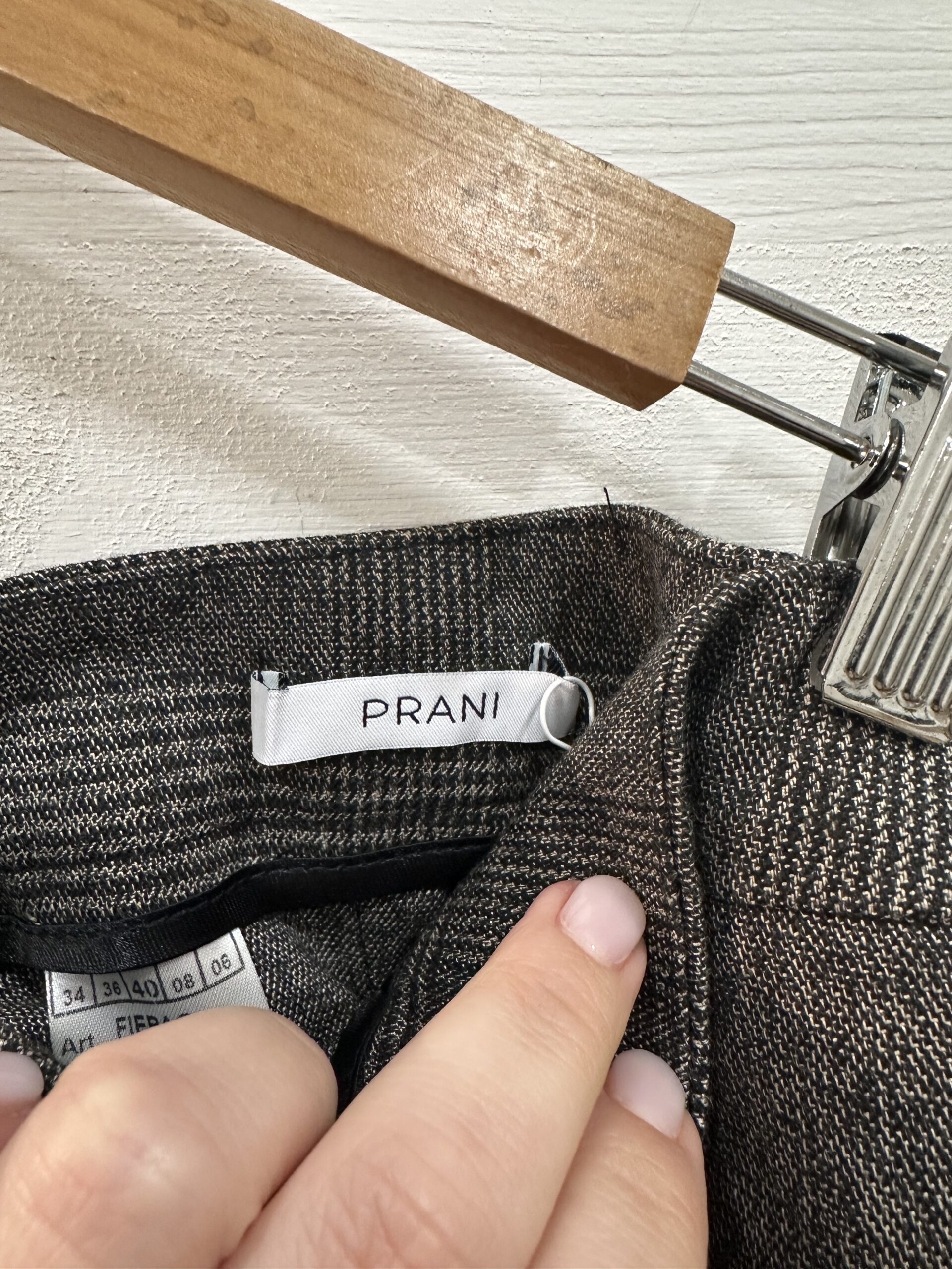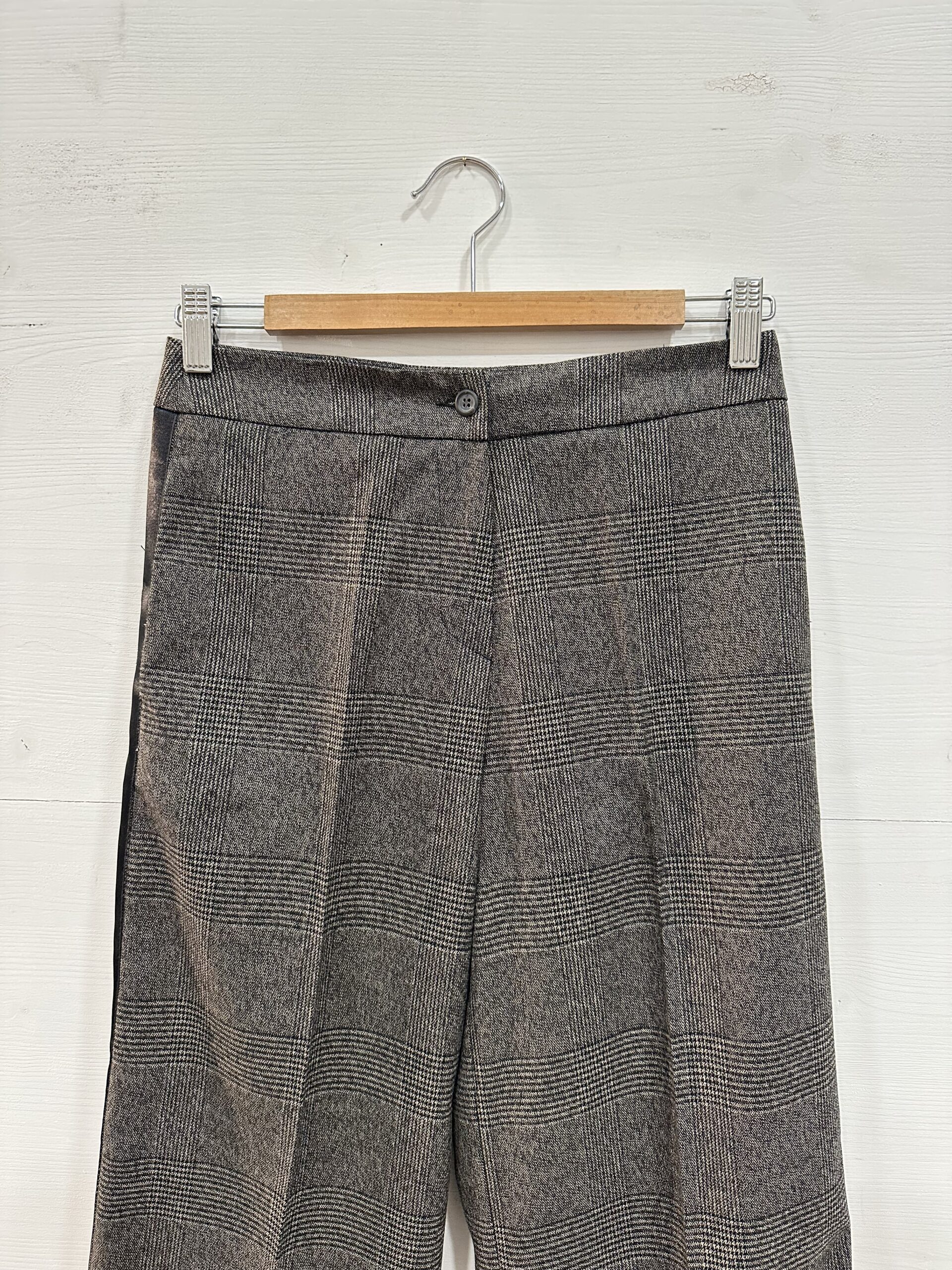 Pantalone a gamba ampia di Prani, fantasia check caramello e nero con bande nere laterali in raso.