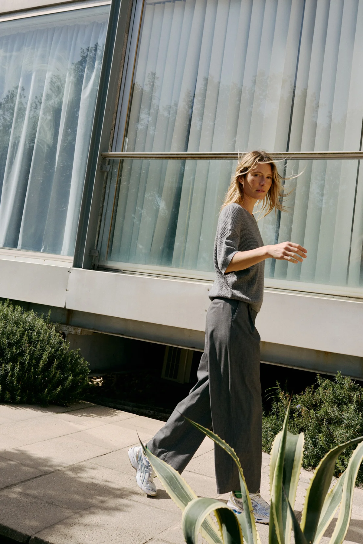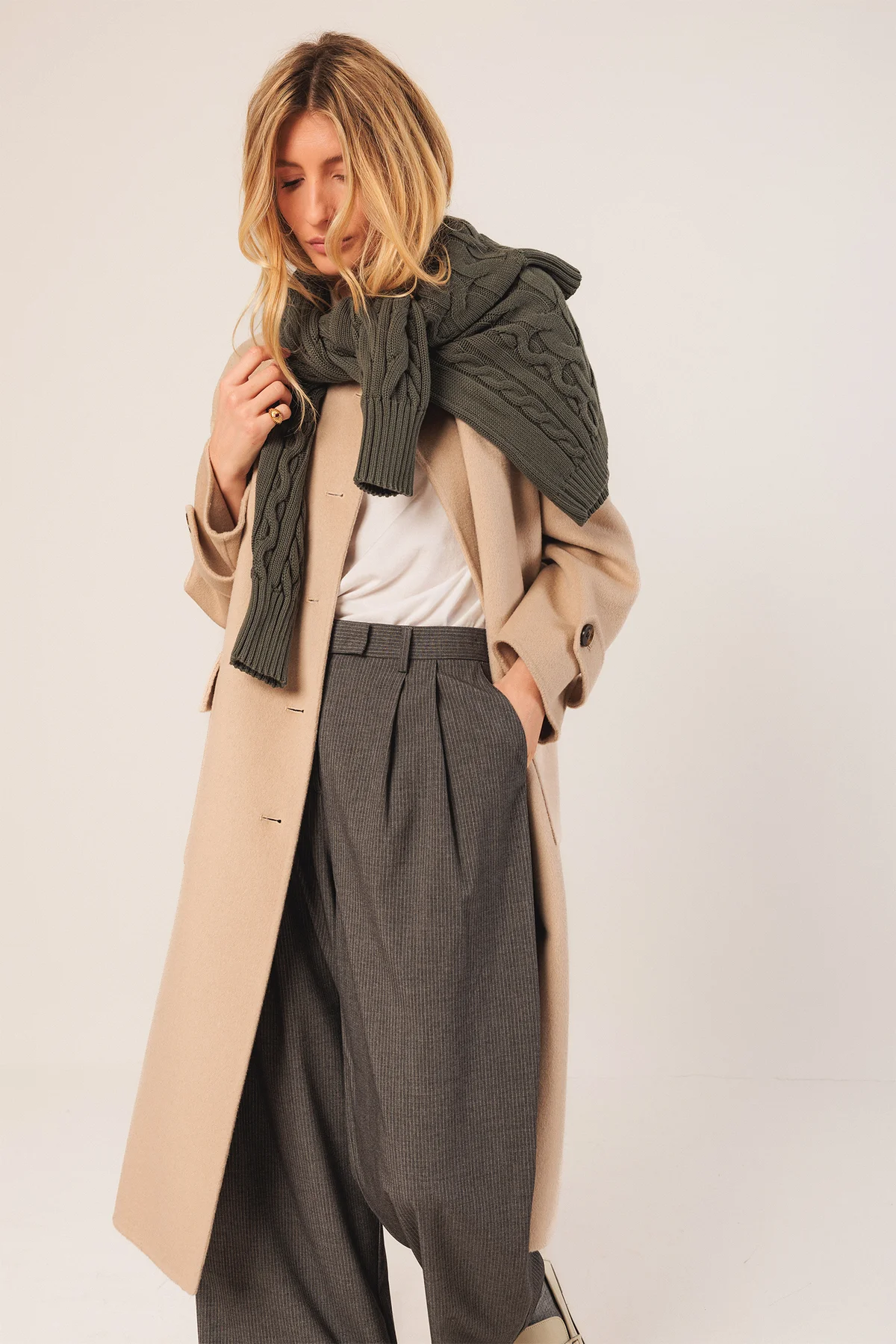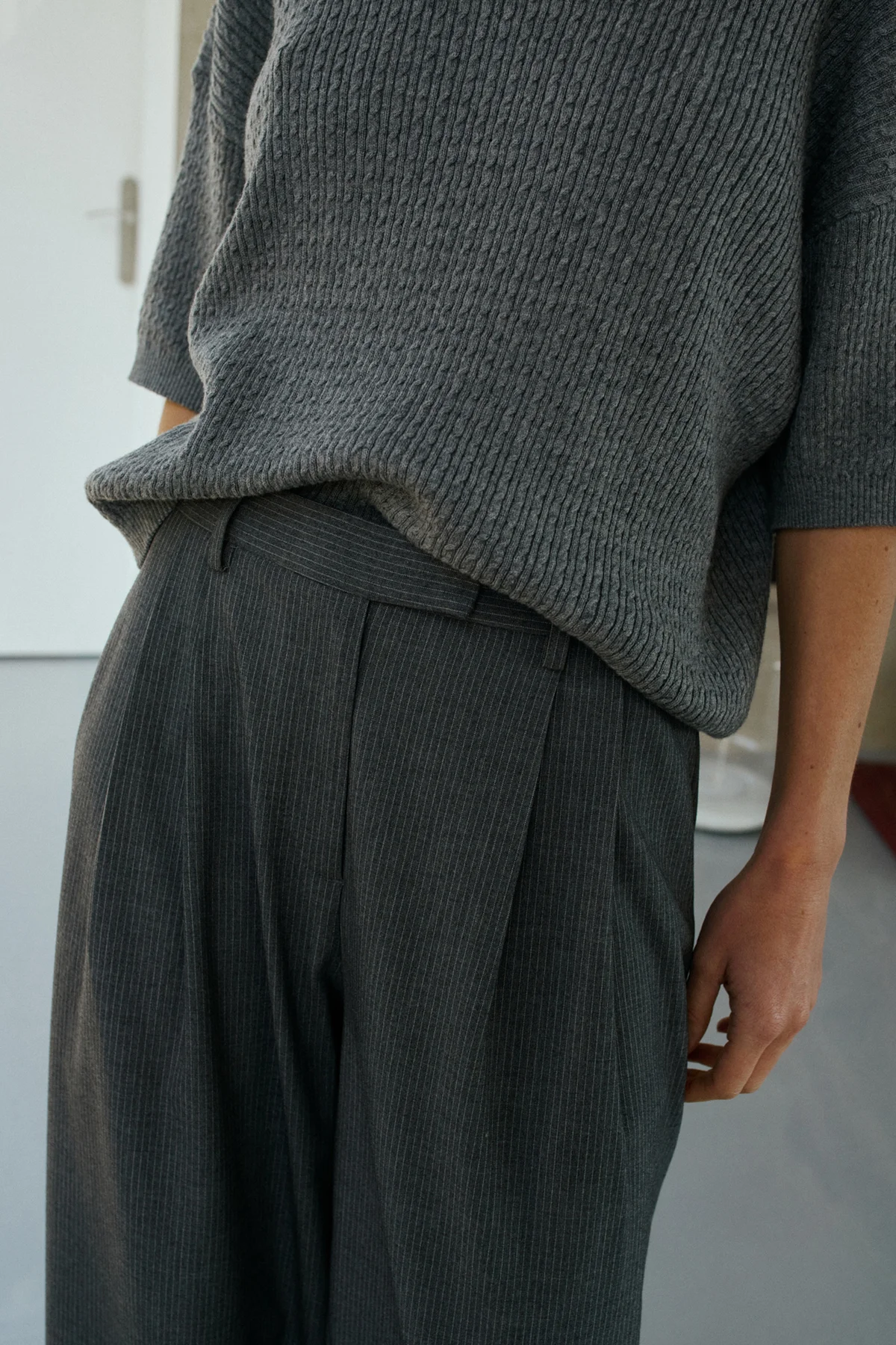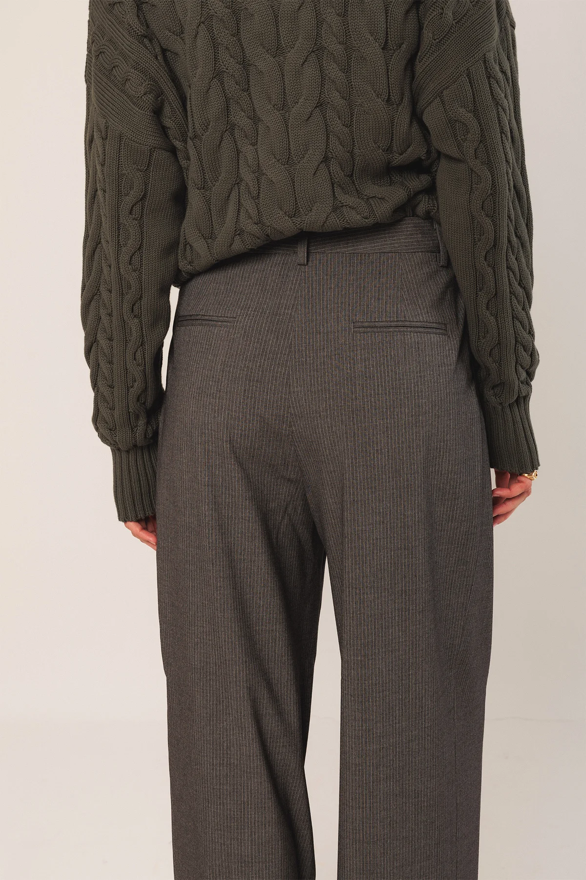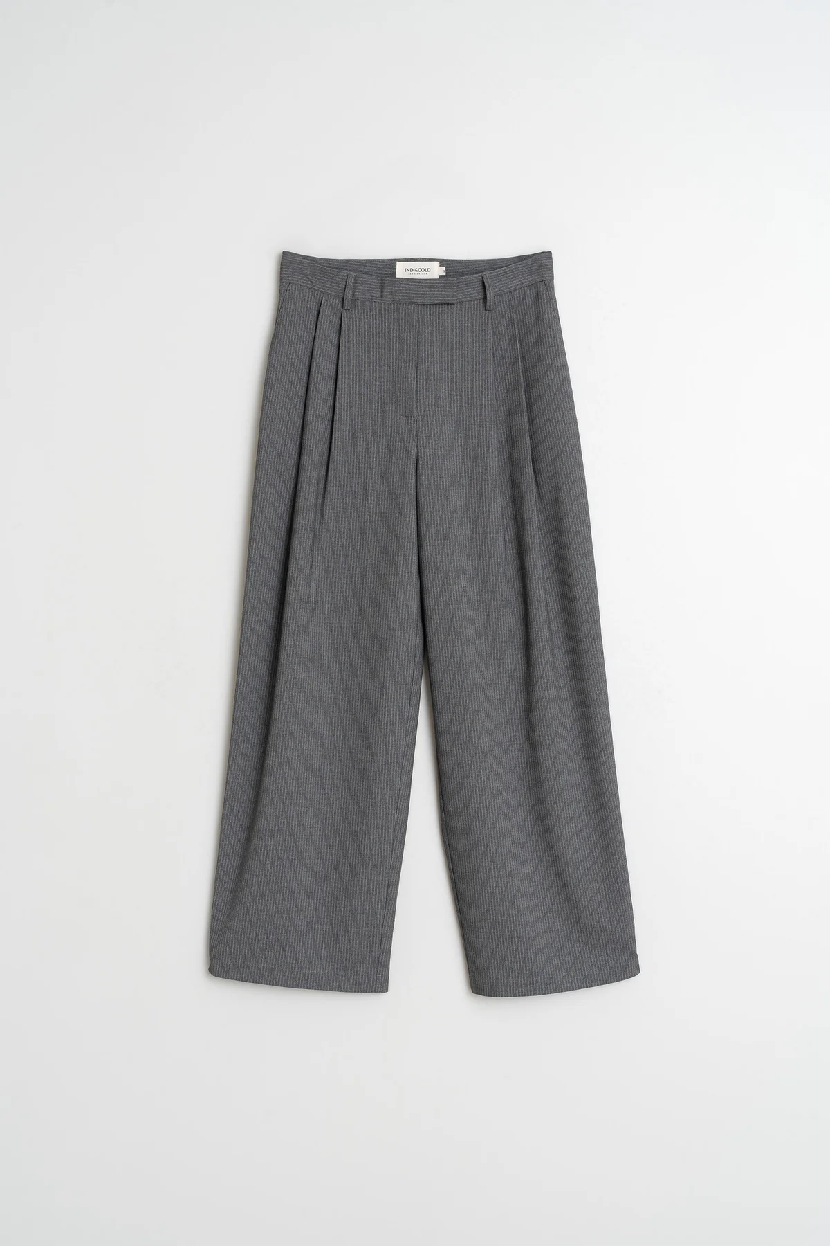 Pantalone gessato a vita media con pinces, gamba larga e tasche posteriori a filo. Perfetto da indossare con scarpe o stivali.