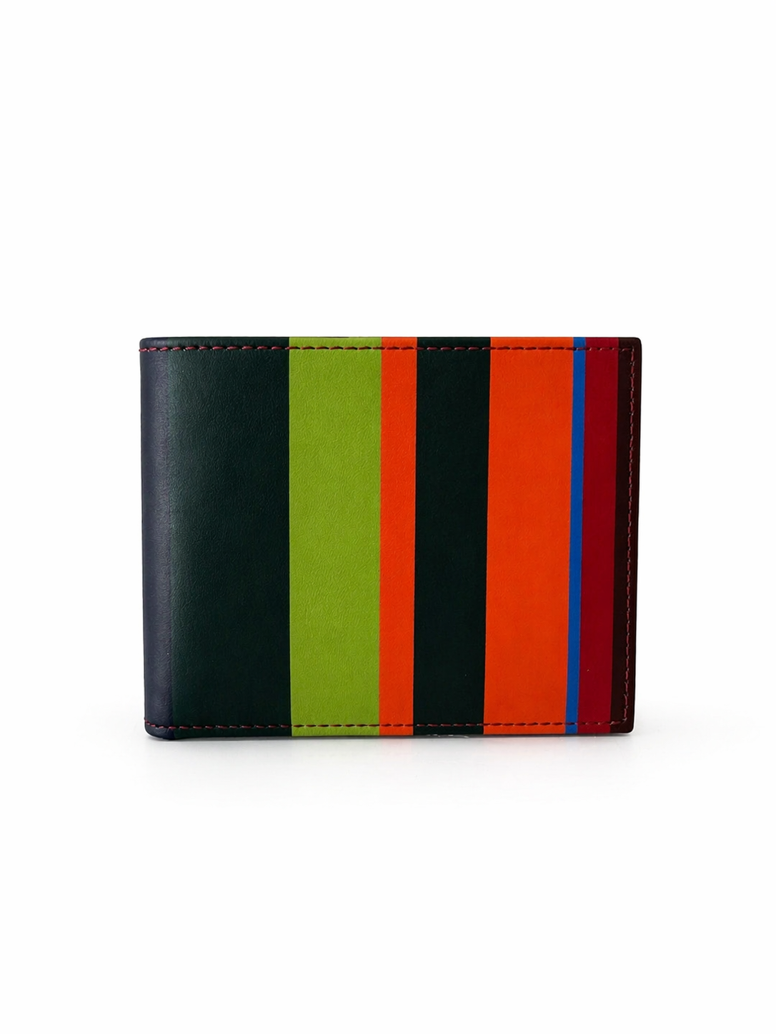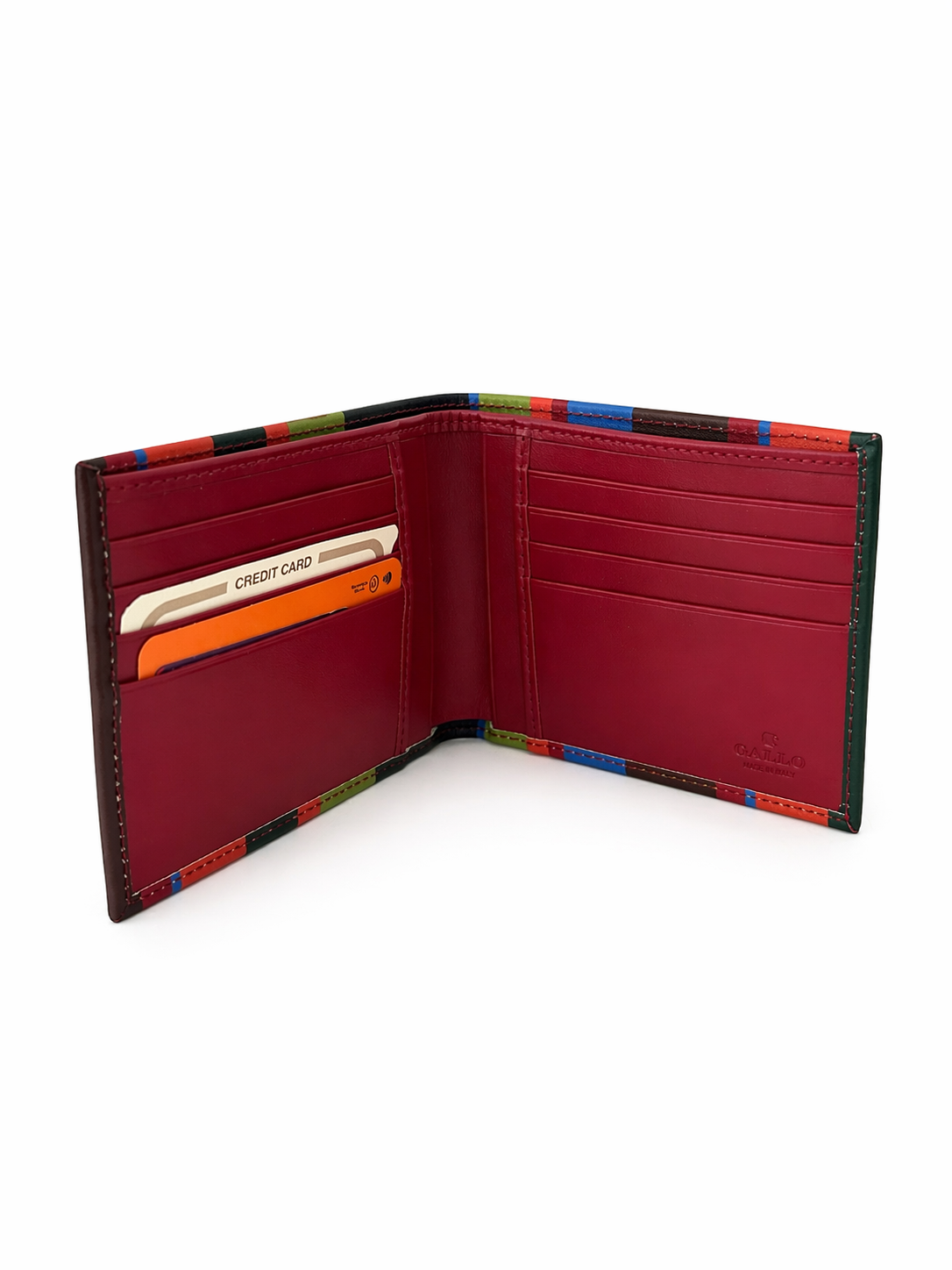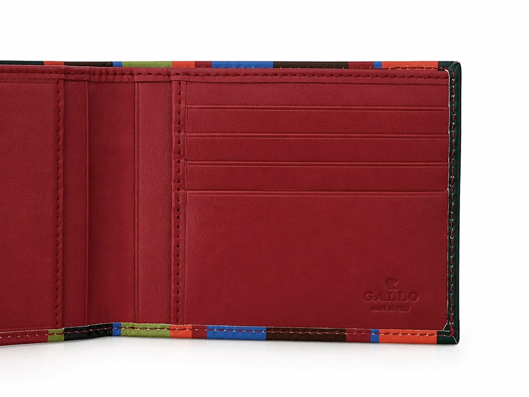 Portafoglio in pelle con iconica multiriga GALLO sui toni del verde e dell’arancio.