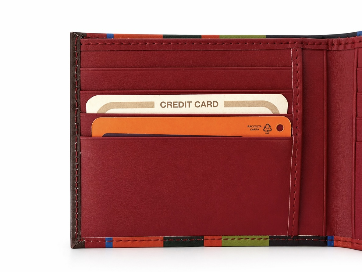 Interno in pelle liscia a contrasto, con numerosi scomparti per carte e banconote.